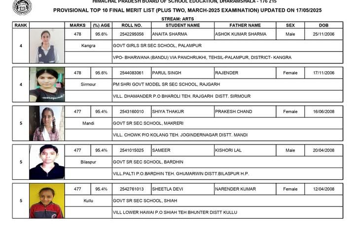 शिक्षा बोर्ड धर्मशाला ने जमा दो कक्षा के तीनों स्ट्रीम कला, कामर्स और साइंस का परीक्षा परिणाम घोषित कर दिया। इस बार जमा दो की परीक्षा 86 हजार 373 छात्रों ने दी थी। इनमें से 71 हजार 591 पास हुए हैं। इनमें से 83.16 प्रतिशत विद्यार्थी पास हुए हैं। सेंट डीआर पब्लिक स्कूल गगरेट ऊना की महक ने साइंस में 97.2 प्रतिशत 486 अंक लेकर प्रदेश भर में पहला स्थान हासिल किया है। इसी तरह आट्र्स में राजकीय वरिष्ठ माध्यमिक पाठशाला रैत, कांगड़ा की अंकिता ने 483 अंक लेकर पहला और कॉमर्स में 482 अंक लेकर राजकीय वरिष्ठ माध्यमिक पाठशाला चनौर, डाडासीबा की पायल शर्मा ने पहला स्थान झटका है। उपायुक्त कांगड़ा एवं शिक्षा बोर्ड के अध्यक्ष हेमराज बैरवा ने कहा कि ओवरऑल में टॉप-10 में 75 छात्रों ने जगह बनाई है।